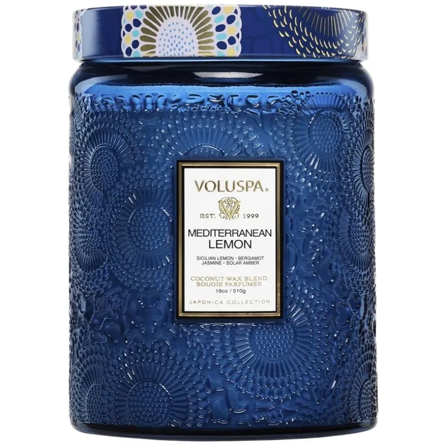 Voluspa Japonica Large Jar Mediterranean Lemon byr på en frisk og strålende duft med noter av siciliansk sitron, bergamott, sjasmin og rav. Lyset kommer i en stor preget blå glasskrukke, som fungerer både som et stemningsskapende duftlys og som et elegant interiørelement.