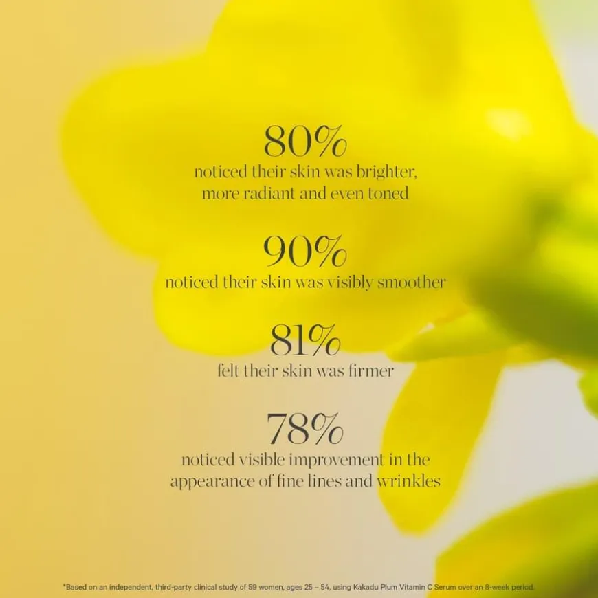 Kakadu Plum Vitamin C Serum er din daglige dose av sertifisert økologisk hudopphellende ingredienser, og inneholder noen av de rikeste naturlige kildene til vitamin C for å forbedre hudtonen og beskytte den mot miljøskader – inkludert superfruktene Kakadu Plum + Acerola Cherry og askorbylglukosid, som er kjent for å være den mest skånsomme formen for stabilisert vitamin C. Serumet er tilsatt hyaluronsyre for å holde på fuktigheten samtidig som det gir lysere hud.