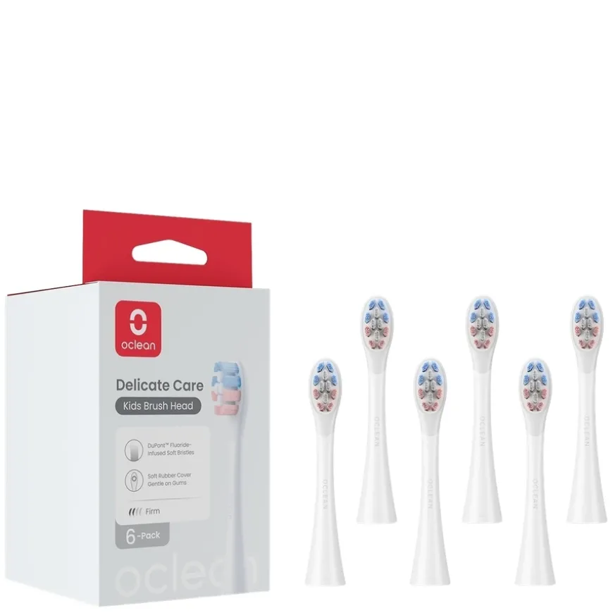 Kids P3K1 Brush Head er spesialutviklede børstehoder for barn, designet for effektiv og ekstra skånsom rengjøring av små munner. Denne 6-pakningen inneholder hvite børstehoder med 15 % mindre størrelse og 20 % mykere bust enn standard Oclean-børstehoder, noe som gjør dem ideelle for barns daglige tannpleie. Bustene er laget av DuPont™-materiale, inkludert fluorinfusert bust som bidrar til å remineralisere tannemaljen, hemme bakteriell vekst og beskytte mot syreangrep. Baksiden av børstehodet er dekket med silikon som er skånsomt mot tannkjøtt og tenner ved kontakt. Børstehodene er produsert i FDA-kompatible materialer, og er trygge å bruke for barn. De gir en dyp, men skånsom rengjøring selv i vanskelige områder. Kompatible med alle Oclean elektriske tannbørster for voksne, noe som gjør dem praktiske for familier der barn bruker samme børstehåndtak som foreldrene.