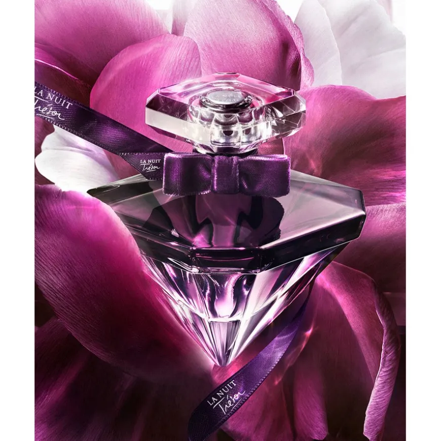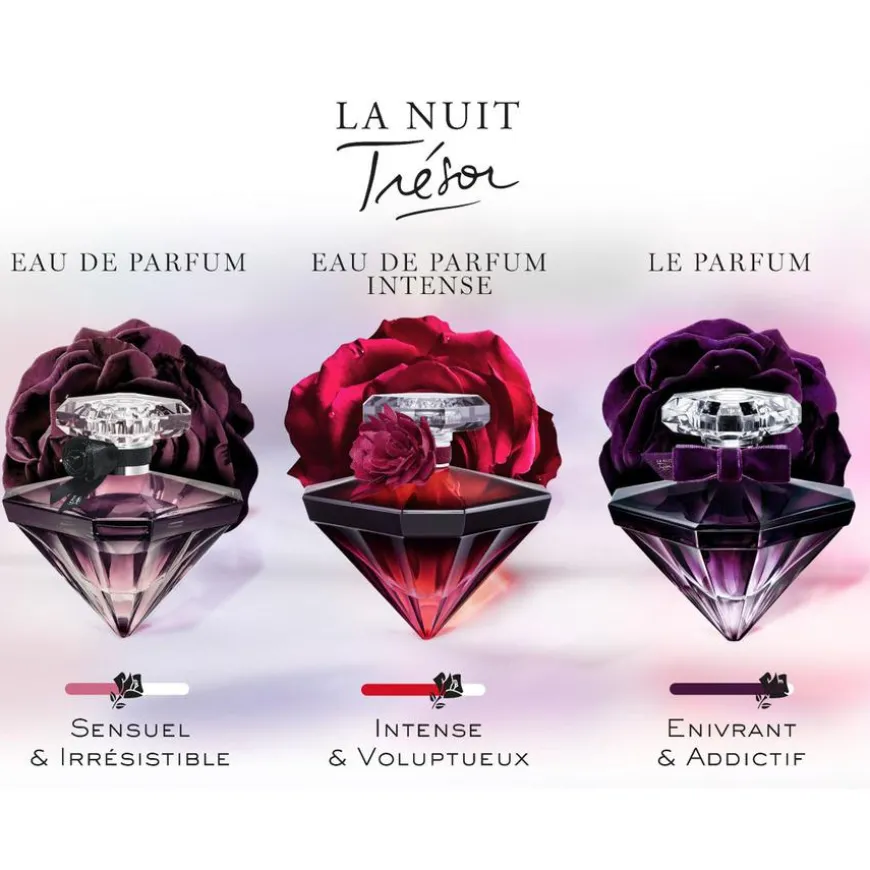 Lancôme sin unike signatur tas til et nytt nivå av sensualitet og lidenskap med La Nuit Trésor Le Parfum, kolleksjonens mest intense. Lancômes nye duft er en eliksir av absolutt rose innhyllet i bitter kakaoekstrakter og solbærnoter. La Nuit Trésor Le Parfum er et subtilt møte mellom sammenstøtet av en overraskelse og ømheten i en ønsket kjærlighet. Le Parfum blir kvinnenes mest dyrebare medskyldige, med hvem de kan glede seg over de kjæreste timene og nattens hemmeligheter, som en eliksir av absolutt rose med bitre kakao-noter.