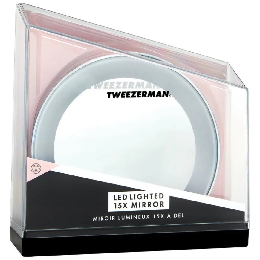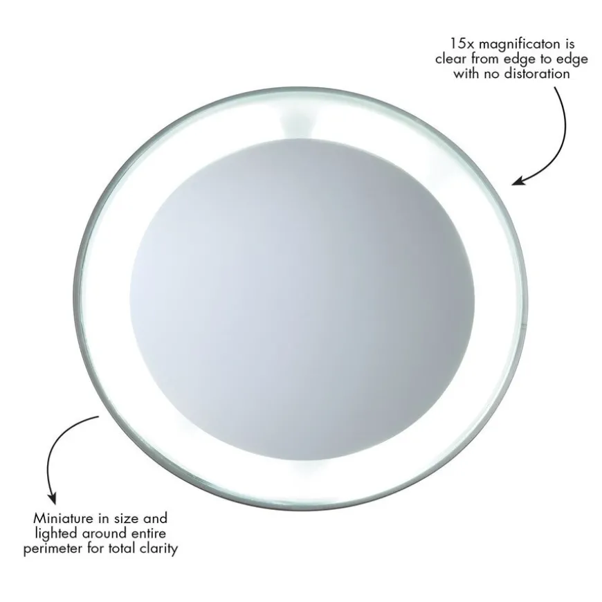 Led 15X Mirror er et innovativt, opplyst forstørrelsesspeil som er optisk korrekt og klart fra kant til kant uten forvrengning. Lyset rundt speilet gir svært god belysning og god klarhet. Ideell for napping av bryn, påføring av make-up eller innsetting av kontaktlinser. Sugekoppene på baksiden festes enkelt på alle glatte, rene overflater. Perfekt for hjem eller reise.
