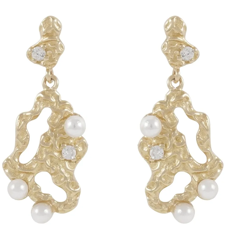 Line Short Earring er et par vakre øredobber fra Snö Of Sweden med hengende design. Øredobbene er laget i gullbelagt messing og dekorert med syntetiske perler og glitrende zirkoniastener. Den organiske formen gir et moderne preg, mens perlene tilfører klassisk eleganse. Perfekt for deg som ønsker et smykke som kombinerer det lekre med det iøynefallende – passer både til fest og hverdags.