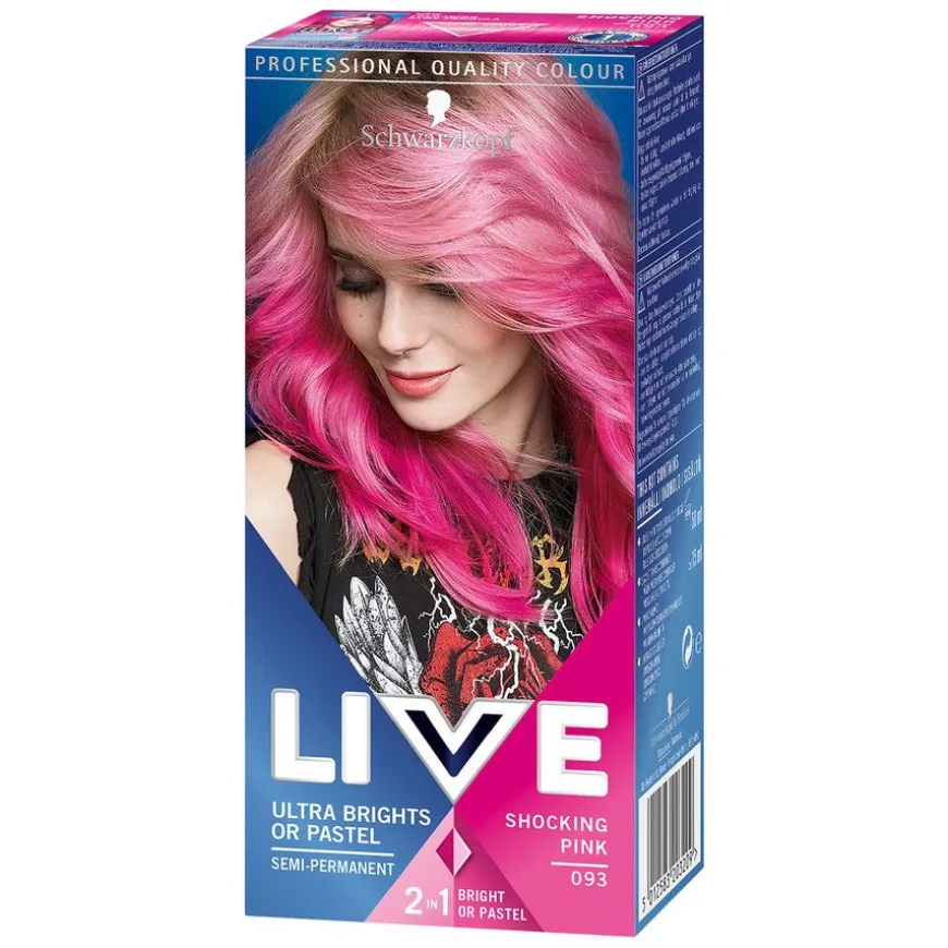 Live Ultra Bright #93 Shocking Pink er en semi-permanent hårfarge.Forsterk personligheten din med en super levende sjokkerende rosa, eller ton den ned ved å blande den med balsamen i pakken for et mykere pastellresultat. Holder i 12-15 vask. Dristig eller pastell? Skap din egen look med Live Ultra Bright 93 Pink.