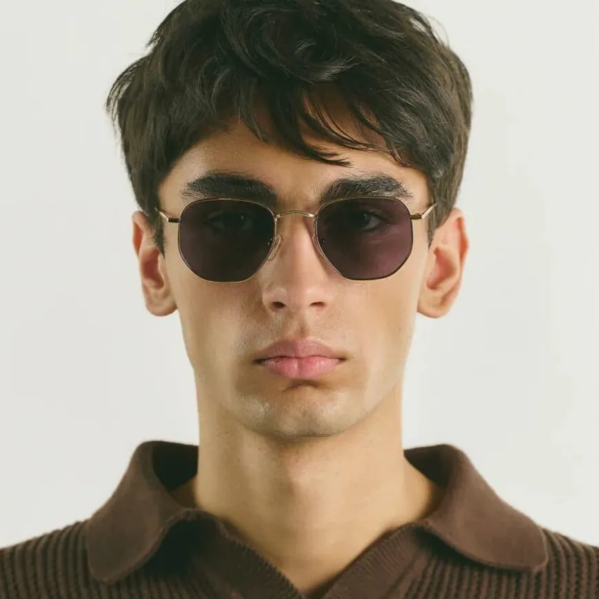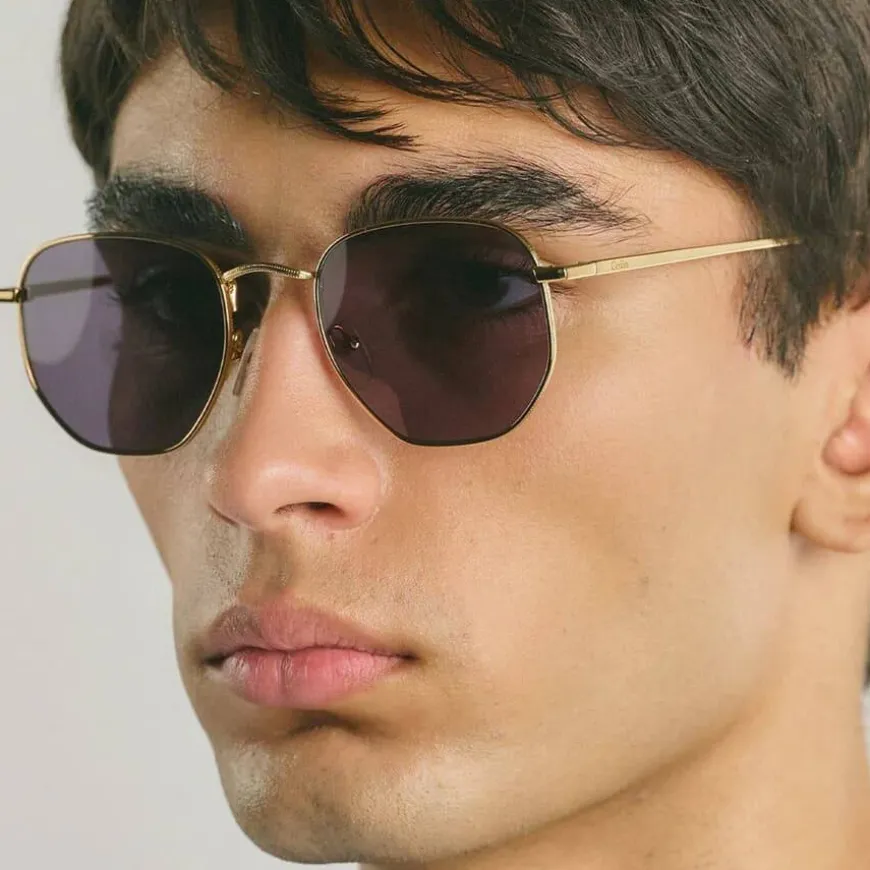 Lucca Gold Black kombinerer en klassisk sekskantet silhuett med en gullfarget metallramme og svarte linser. Dette tidløse designet gir et dristig, elegant utseende med et moderne preg.
