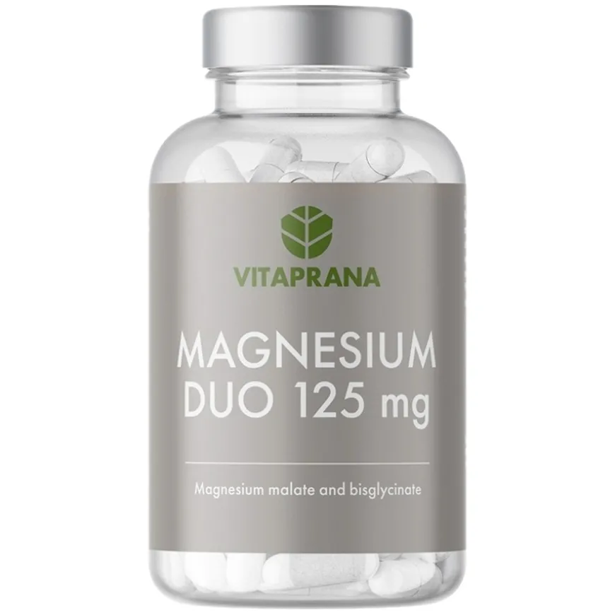 Magnesium Duo gir en optimal kombinasjon av magnesiumkilder for best mulig opptak. Vitaprana Magnesium Duo 125 inneholder 125 mg magnesium per kapsel, sammensatt av magnesiumbisglycinat og magnesiummalat – to former kjent for sin høye biotilgjengelighet. Magnesium bidrar til normal funksjon av nervesystemet, normale muskelfunksjoner og opprettholdelse av elektrolyttbalansen. Et perfekt valg for deg som ønsker å støtte kroppens funksjoner effektivt og naturlig, spesielt i forbindelse med fysisk aktivitet eller ved leggetid.