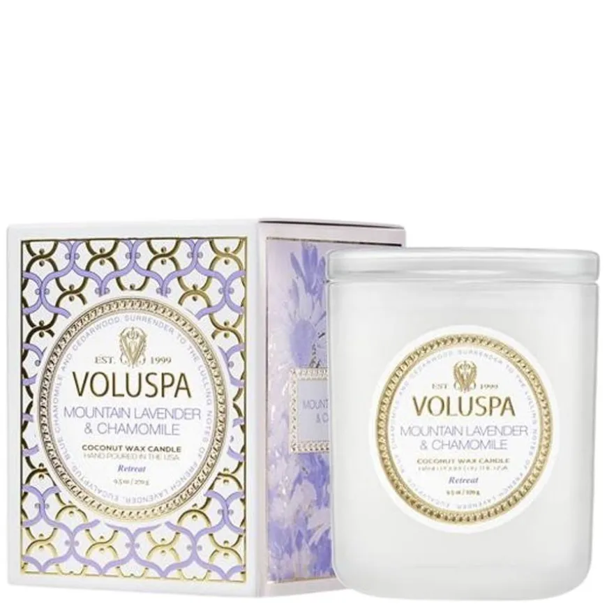 Maison Classic Boxed Candle Mountain Lavender & Chamomille er et duftlys med en beroligende og balansert blanding av provençalsk lavendel, eukalyptus, blå kamille og sedertre. Lyset kommer i et frostet hvitt glass med dekorative gull- og lavendeldetaljer, og leveres i en nydelig gaveeske – perfekt for avslapning og ro i hjemmet.