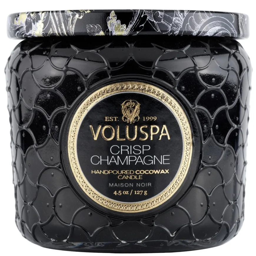 Crisp Champagne Petite Jar Candle dufter av sprudlende tørr champagne blandet med vanilje og eik. Rike fargetoner pryder denne vakre tinnboksen.
