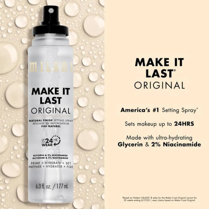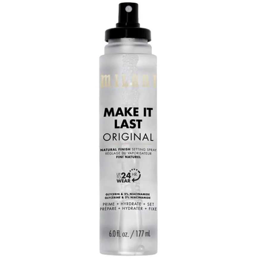 Make It Last Original Natural Finish Setting Spray er en sminke-låsende magi, nå i en jumbo-størrelse. Med opptil 24 timers hold, leverer Amerikas #1 setting spray vanntette og svettebestandige resultater du kan stole på for å låse inn utseendet ditt i lang tid.* Laget med fuktighetsrik glyserin og multitaskende hudkraftverk 2 % niacinamid, forbereder, hydratiserer og setter denne lette sprayen sminke og etterlater huden med en perfekt naturlig finish. Den veganske og dyrevennlige formelen hjelper også med å holde sminken fra å falme og sette seg i linjer, slik at utseendet ditt varer hele dagen og natten.