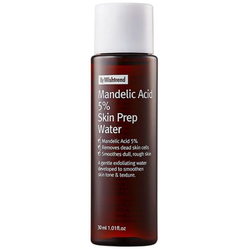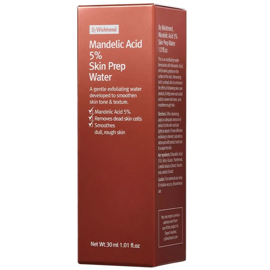 Mandelic Acid 5% Skin Prep Water er en leave on-eksfoliering som gir fukt og hjelper til med å fjerne døde hudceller slik at huden blir strålende og myk. Et resultat av dette er en sunnere glød og fasthet ettersom cellefornyelsen øker. Produktet vil forbedre etterfølgende hudpleie. Beriket med mandelsyre ( AHA) som er spessielt god mot hyperpigmentering, reduserer fine linjer og forbedrer en grov hudstruktur. Mandelsyre viser også fantastiske egenskaper for å behandle akne, fet hud, urenheter, rosacea og andre betennelsestilstander i huden. Ingredienser som panthenol, betaglukan og hyaluronsyre fukter, roer ned og reparerer huden.