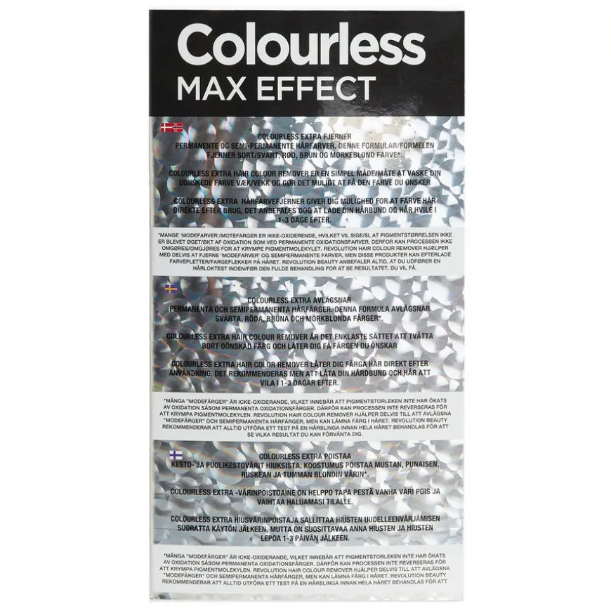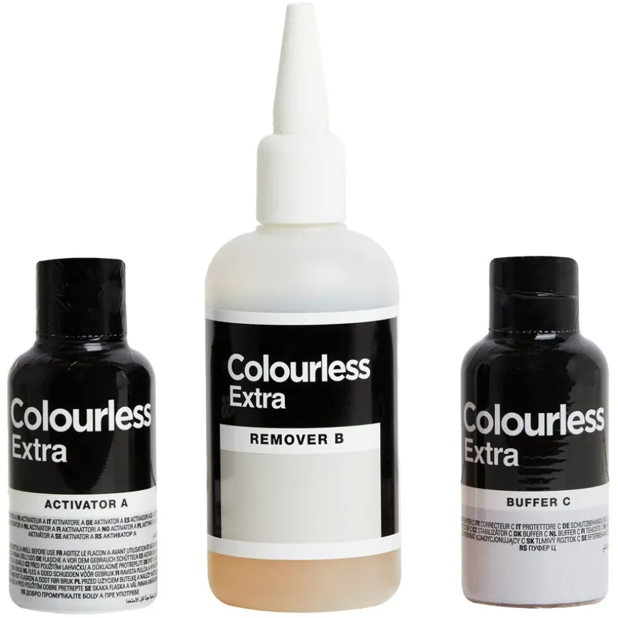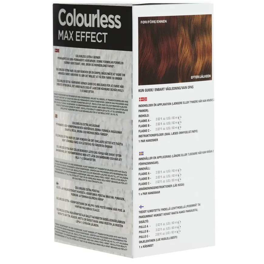 Colourless Max Effect Hårfargefjerner fjerner effektivt permanent og semi-permanent hårfarge, inkludert vanskelige nyanser som brunt, rødt og fargeoppbygging. Denne hårfargefjerneren er trygg og skånsom, uten blekemiddel eller ammoniakk og passer for de fleste hårtyper. Settet inneholder en aktivator, fargefjerner, buffer, hansker og en full instruksjonsbrosjyre. Produktet er imidlertid ikke egnet for henna-behandlet eller afro-teksturert hår. Det anbefales heller ikke for barn under 16 år. For best resultat anbefales det å utføre en test på et lite område før full påføring. Du kan farge håret på nytt umiddelbart etter bruk, men det anbefales å la hodebunnen og håret hvile i 1-3 dager.