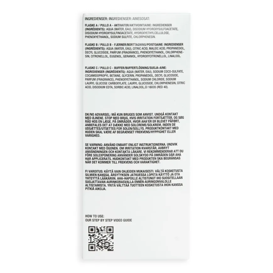Aqua (Water, Eau), Disodium Hydroxysulfoacetate, Disodium Hydroxysulfinoacetate, Hydroxyethylcellulose, Phenoxyethanol, Sodium Sulfite, Chlorphenesin. Remover: Aqua (Water, Eau), Citric Acid, Maleic Acid, Propanediol, Decyl Glucoside, Parfum (Fragrance), Phenoxyethanol, Chlorphenesin, Citronellol, Eugenol, Geraniol, Hydroxycitronellol, Linalool. Buffer: Aqua (Water, Eau), Sodium Coco-Sulfate, Cocamidopropyl Betaine, Glycerin, Propanediol, Decyl Glucoside, Parfum (Fragrance), Phenoxyethanol, Sodium Chloride, Sodium Lauryl Glucose Carboxylate, Lauryl Glucoside, Chlorphenesin, Citric Acid, Disodium Edta, Sorbic Acid, Linalool,Ci 16035 (Red 40). Produktens ingredienslista kan uppdateras över tid. Konsultera alltid ingredienslistan som finns på den köpta produktens förpackning.
