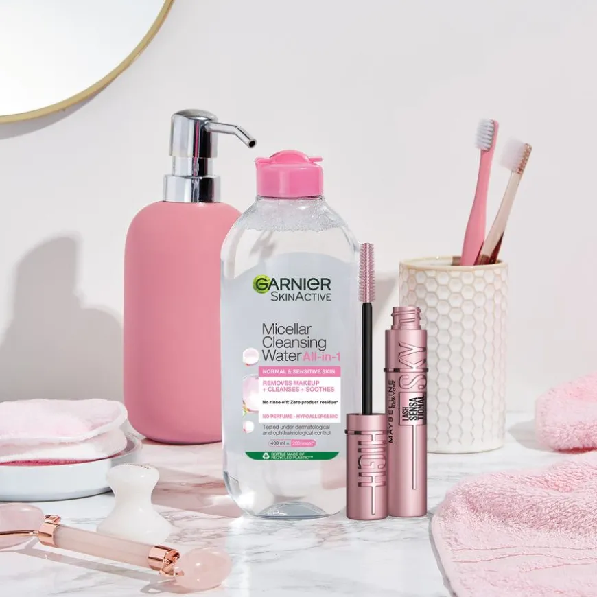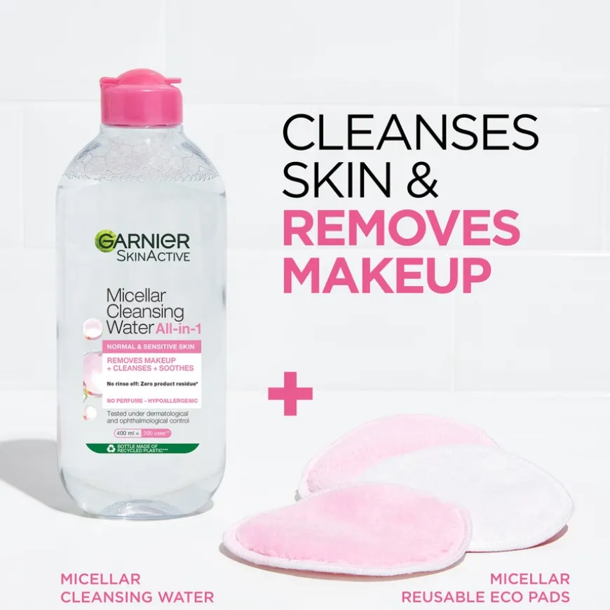- Garnier Micellar Cleansing Water Normal & Sensitive Skin renser huden for smuss og sminke.