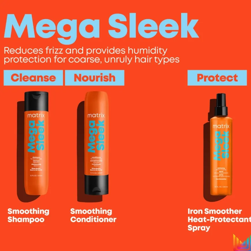 - Matrix Mega Sleek Conditioner er en balsam som hjelper å kontrollere grovt hår og håndterer krus, samtidig som den beskytter mot fuktighet i opp til 24 timer* for glatthet. Tilført med Shea Butter, hjelper denne balsamen med å gi næring og glattgjøre håret. *Når du bruker den fullstendige Mega Sleek serien.