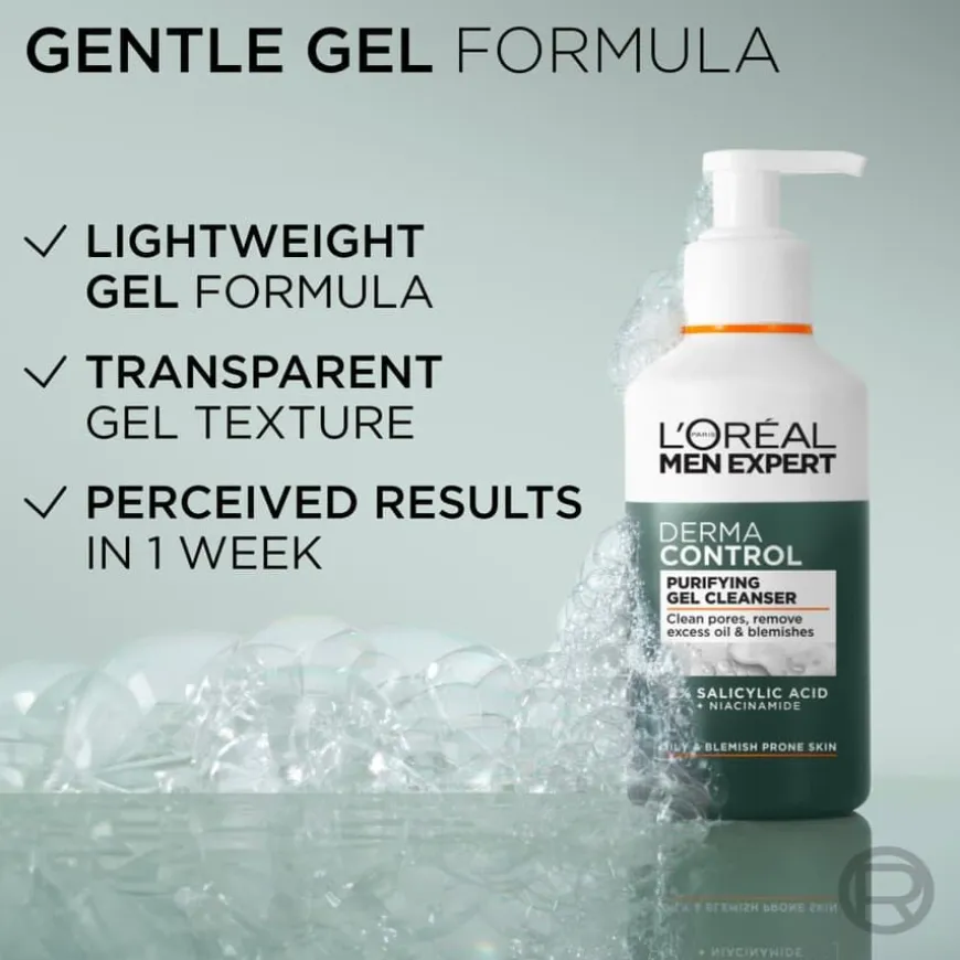 L’Oréal Paris Men Expert Derma Control Anti-Blemish Cleanser er en rensegelé til deg med fet hud med tendens til urenheter. Den er utviklet for å rense porene, fjerne overskytende oljer, redusere sebum* og gi huden en lett eksfoliering. Formelen er beriket med niacinamid og 2 % salisylsyre for å rense huden effektivt og skånsomt og forebygge fremtidige utbrudd av urenheter. Velegnet til sensitiv hud.