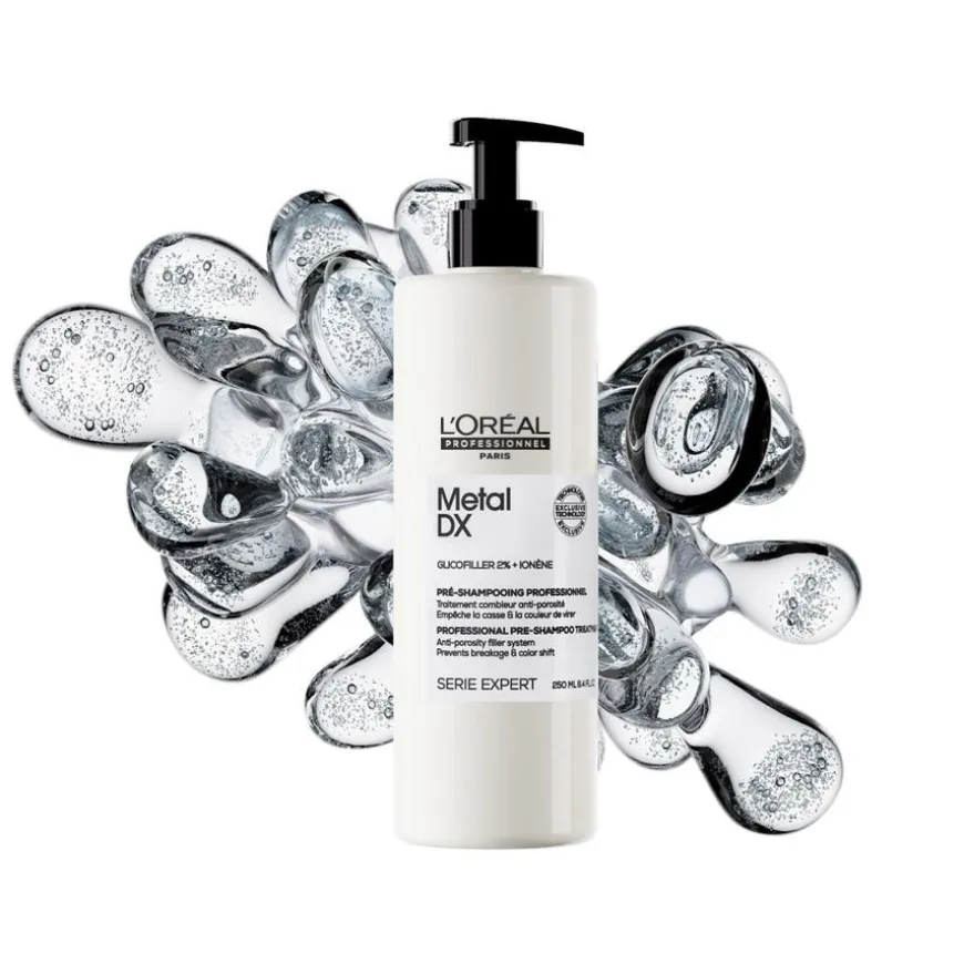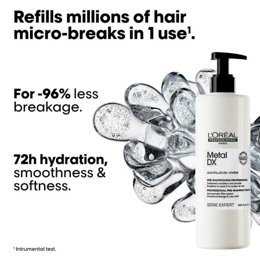 Vask etter vask kan metallpartikler, som f.eks. kobber, trenge seg inn i dine hårfibre. Metallpartikler kan skape en risiko for knekte hårstrå og endringer i hårfargen. L’Oréal Professionnel Metal DX Pre-Shampoo er en pre-shampoo-behandling som er konsentrert med glicofiller og fyller på med millioner av mikro-brudd i håret ved én bruk. Skadet hår forsterkes og beskyttes mot, at nye partikler deponeres for å redusere mengden av knekte hårstrå, og gir 72 timers fuktighet.*