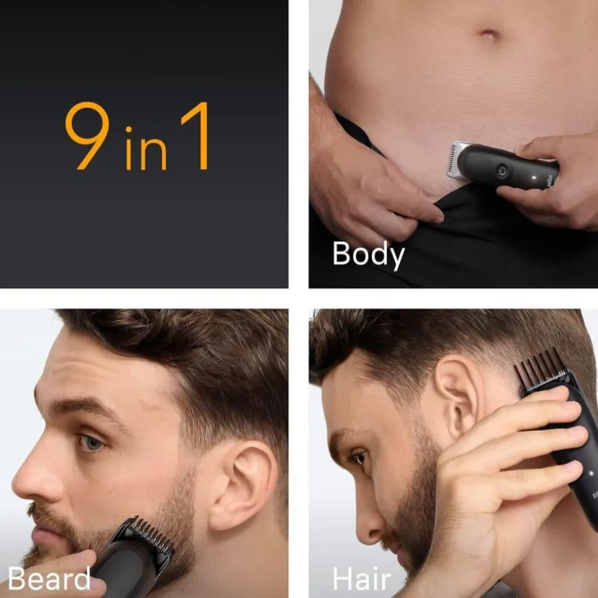 Brauns allsidige alt-i-ett-groomingsett for menn. Med dette 9-i-1-settet kan du enkelt trimme skjegget, fjerne hår i ører og nese, klippe håret og pleie hele kroppen. Oppnå presisjon og effektivitet på en komfortabel måte med det ultraskarpe bladet. Sikker og perfekt kroppspleie med SensitiveTrim-teknologi. 14 lengdeinnstillinger og AquaGrip for bruk i vann gir deg full kontroll over groomingen. Braun AIO Series 5 er konstruert for å vare, er vanntett og har et li-ion-batteri som gir opptil 120 minutters brukstid. Inneholder: 1 trimmer, 7 kammer, 1 rengjøringsbørste, 1 pose.