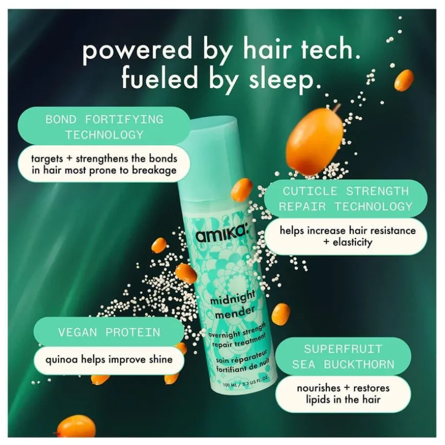 Midnight Mender Overnight Strength Repair Treatment Mask er en klinisk dokumentert nattbehandling som styrker, pleier og glatter håret mens du sover – for synlig sunnere hår om morgenen. Denne nattmasken passer for alle hårtyper, spesielt for deg med skjørt, skadet eller porøst hår som viser tegn på kjemisk, termisk, mekanisk eller miljørelatert slitasje. Midnight Mender jobber mens du sover med å redusere hårbrudd og gjenoppbygge styrke takket være en avansert formel med bond fortifying-teknologi, cuticle strength repair-teknologi og superfrukten tindved (sea buckthorn). Den kremete formelen er putevennlig og utviklet for å reparere alle typer skader, samtidig som den beskytter håret mot fremtidig skade og forsegler flisete tupper.