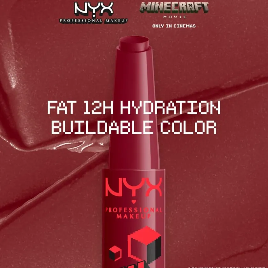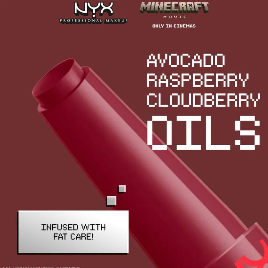 Fat Oil Slick Click Lipbalm fra NYX Professional Makeup er en limited edition-leppepomade utviklet i samarbeid med A Minecraft Movie, og gir både glans og pleie til eventyrlystne lepper. Den er utviklet for å gi langvarig fuktighet i opptil 12 timer, samtidig som den gir leppene en nydelig glans og lett fargetone. Med en næringsrik, vegansk formel proppfull av plantebaserte oljer som avokado-, multe- og bringebærolje, pleier og beskytter den leppene effektivt. Den klikkbare sticken er enkel å bruke, og perfekt for et «pixel-perfect» smil – enten du er i Minecraft-universet eller i det virkelige liv. Passer for alle hudtyper og er unisex.