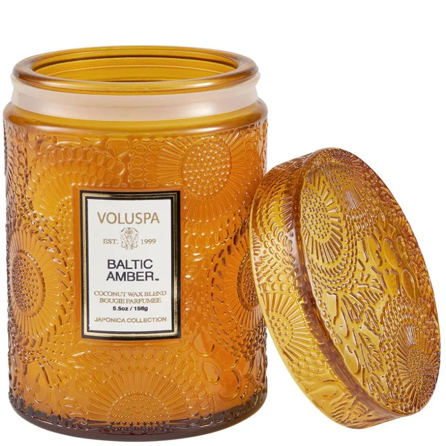 Baltic Amber Mini Glass Jar fra Voluspa med duft av rav, sandeltre og vanilje. Fargede glass med Japonicas signaturmønster, toppet med et matchende lokk.