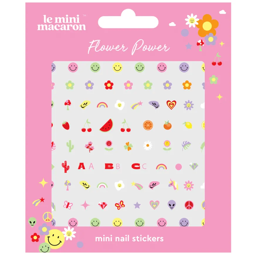 Få frem grooven din med Flower Power Mini Nail Stickers. Denne pakken med fargerike negleklistremerker inkluderer blomster, enhjørninger, sommerfugler, smileys mm.