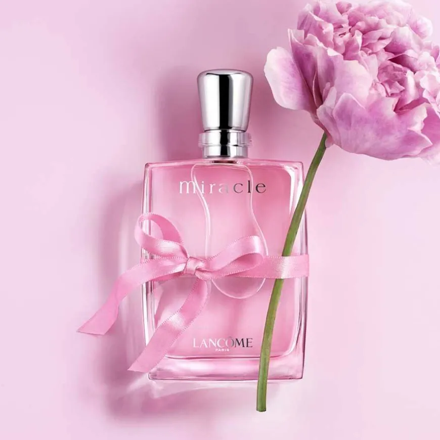 Miracle-flasken er ren, moderne og elegant. Den er et skinnende blankt lysprisme, hvor det transparente glasset avslører duftens rosa farge, som et symbol på daggryets vakre rosenrøde farge.