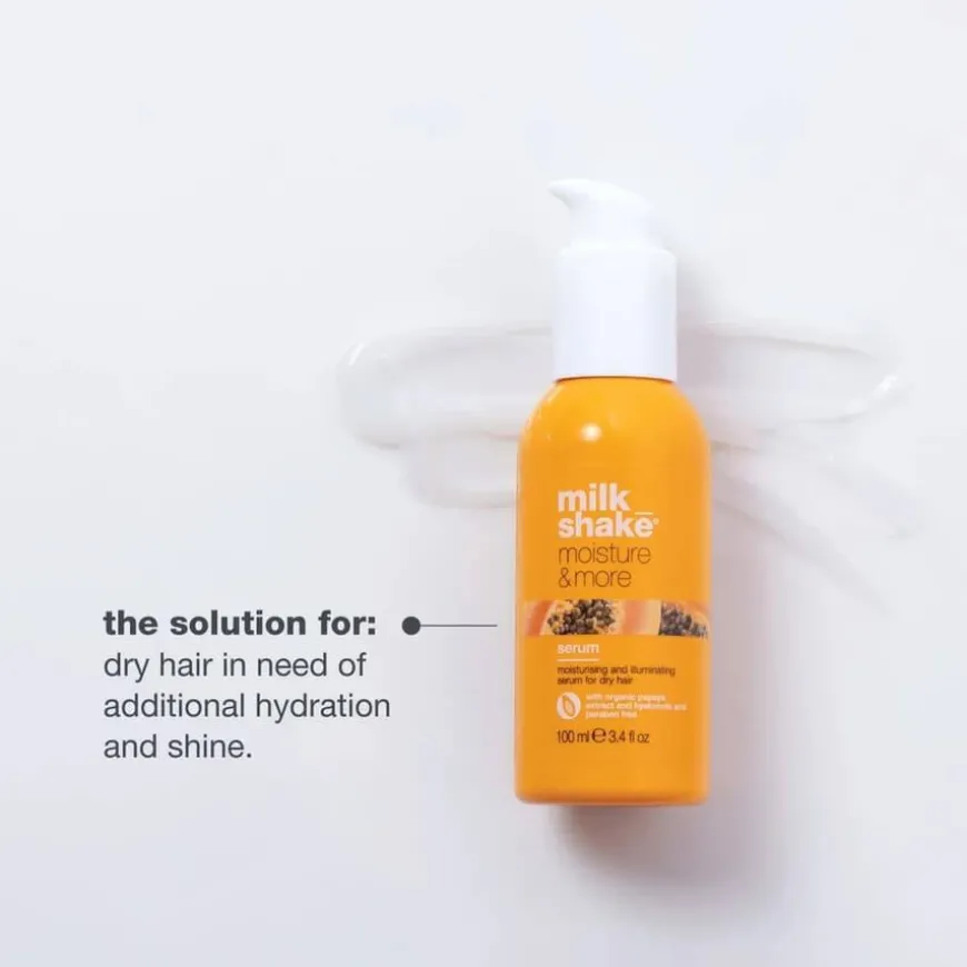 Moisture & More Serum er et lett leave-in-serum utviklet spesielt for tørt, livløst og fuktfattig hår. Den næringsrike formelen kombinerer melkeproteiner, fruktekstrakter, hyaluronsyre og niacinamid, som gir intens fuktighet, gjenoppretter mykhet og gjør håret silkemykt og glansfullt – uten å tynge. Serumet inneholder også Integrity 41®, som beskytter hårfargen og forhindrer oksidativt stress, samt tropiske fruktekstrakter fra papaya, mango og gojibær, som virker revitaliserende og oppfriskende. Den antioksidantrike sammensetningen bidrar til å beskytte håret mot ytre påvirkninger og gir det et sunnere og mer motstandsdyktig utseende. Perfekt for daglig bruk – kan påføres flere ganger daglig i tørt hår for å friske opp og tilføre glans til frisyren.