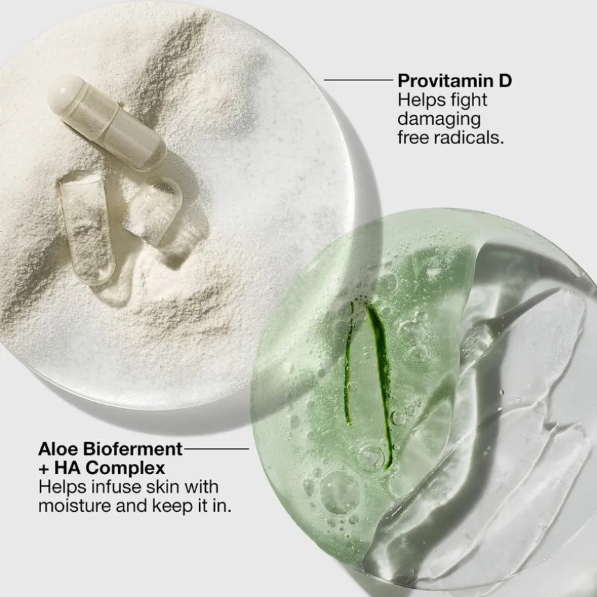 - Denne ansiktskremen beskytter huden din mot dehydrerende faktorer som værforhold, forurensning og solens stråler med Aloe Bioferment + HA Complex og D-vitamin.