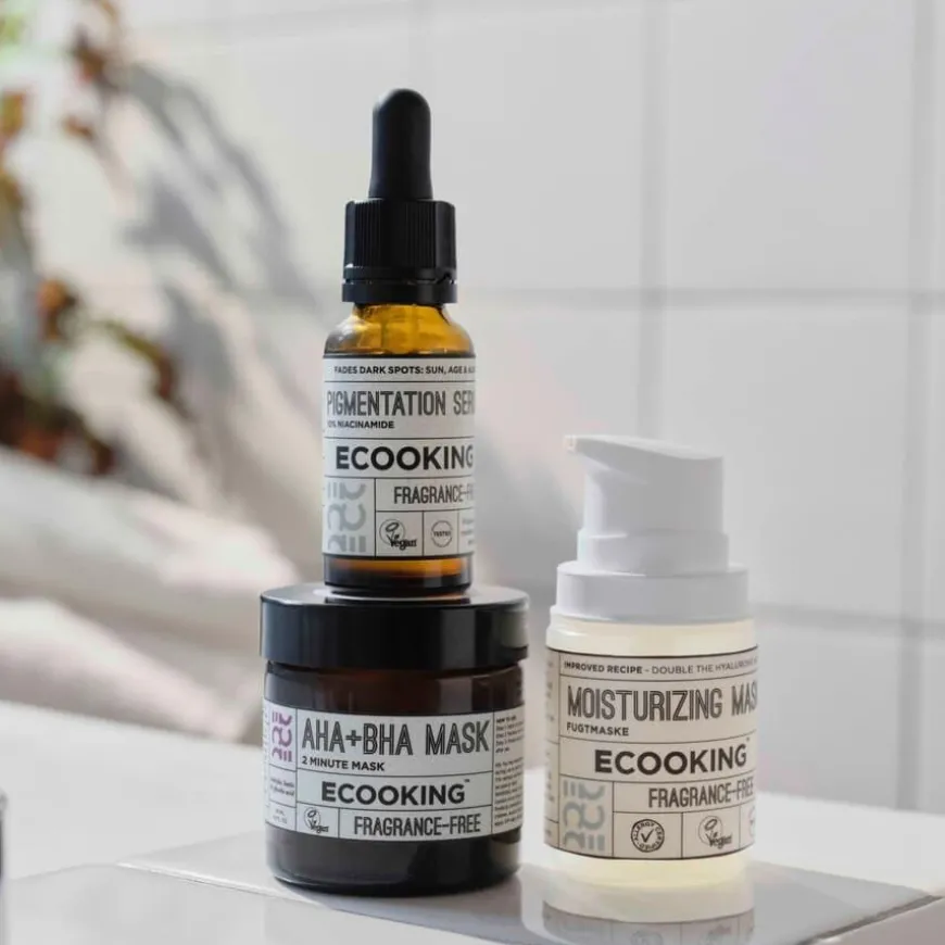 Moisturizing Mask fra ECOOKING er en forbedret fuktmaske med en lettere konsistens som absorberes raskere og gir maksimal fukt uten å føles fet. Med en fordoblet mengde hyaluronsyre tilfører den huden intens fukt og bidrar til å glatte ut fine linjer. Masken inneholder to typer hyaluronsyre: én med lav molekylvekt som trenger dypt inn og jobber med linjer og fuktbalanse, og én med høy molekylvekt som legger seg på hudens overflate for å mykgjøre og beskytte. I tillegg er masken beriket med økologisk aloe vera og naturlig rødbedeekstrakt, som fukter i dybden og forebygger tørr hud. På bare 10 minutter blir huden mykere og mer strålende, og ved regelmessig bruk får den en jevnere og glattere struktur.