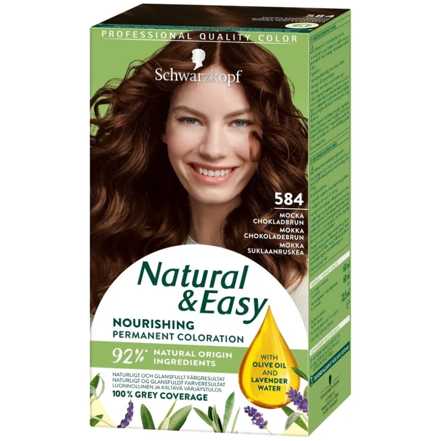 Natural & Easy er en hårfarge-serie fra Schwarkopf, for de som vil dekke grått hår fullstendig, samtidig som de ønsker et naturlig, uttrykksfullt fargeresultat. Hver nyanse inneholder mørke og lyse fargepigmenter som gjør at håret ser levende og glansfullt ut. Produktet er beriket med nærende Oil Nutritive Serum som intensivt pleier håret.