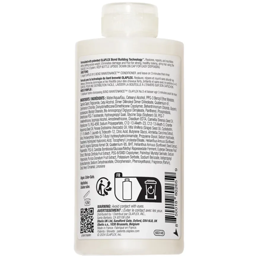 No. 5 Fine Bond Maintenance Conditioner er en konsentrert, fargesikker balsam som reduserer brekkasje og styrker håret ved hver vask. Denne fuktighetsgivende balsamen tilfører rikelig med fukt og næring til alle hårtyper, samtidig som den løser opp floker og forbedrer hårets glans og håndterbarhet. Formulert med panthenol og glyserin for optimal hydrering og styrke. Resultatet er et sunnere, glattere og mer motstandsdyktig hår. Perfekt for deg med fint hår som ønsker styrke, glans og pleie. Klinisk testet i kombinasjon med No.3, No.4 og No.5 for å gi merkbart bedre resultater etter én bruk.