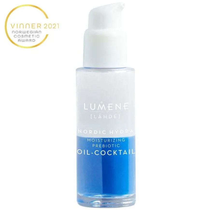 Lumene Lähde Nordic Hydra Moisturizing Prebiotic Oil-Cocktail er en intens fuktighetsgivende serum. Olje-cocktailen er tilsatt prebiotic xylitol og komplimenterer hudens fuktighetsbarriere og dens naturlige mikrobiome. Den pleiende formulaen hydrerer huden i 24 timer med den essensielle nordiske blandingen av arktisk kildevann, organisk bjørkesaft og nordisk blåbærfrø-olje. Serumet er spesielt utviklet for tørr og dehyrdrert hud.