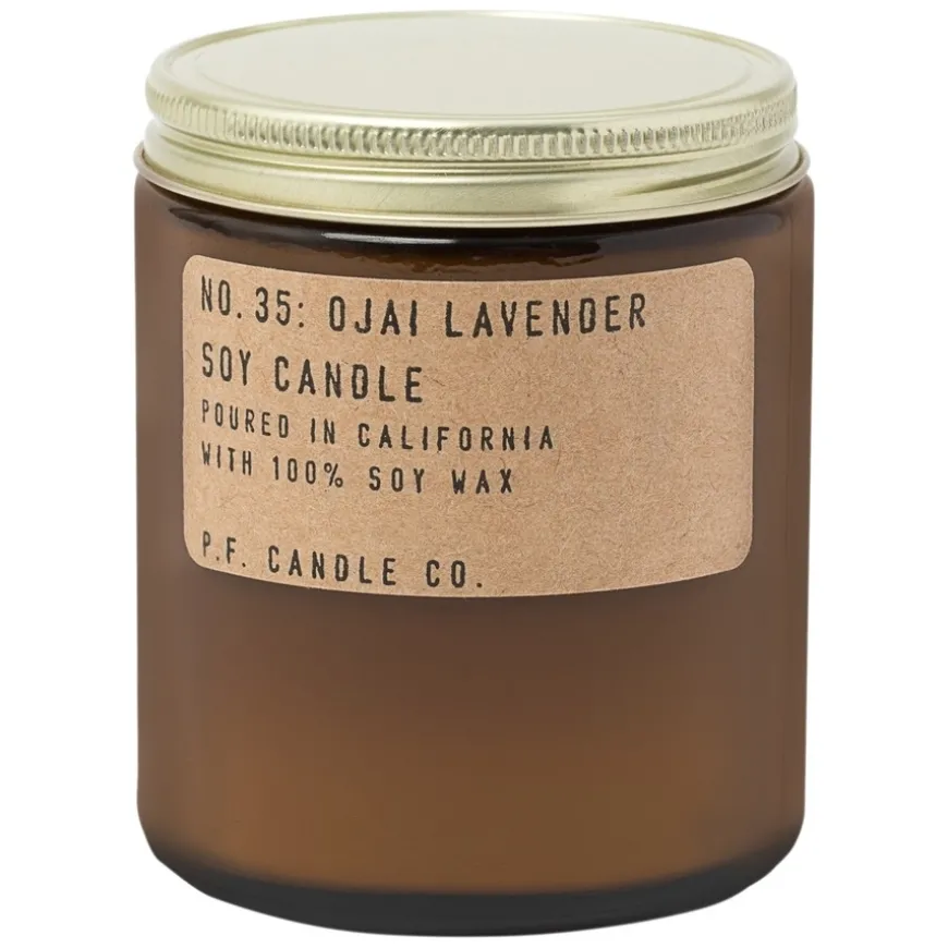 P.F. Candle Co. Ojai Lavender Standard Soy Candle er et håndlaget duftlys inspirert av Ojai-dalens solfylte lavendelåkre og appelsinlunder. Med en beroligende blanding av pixie-mandarin, blå lavendel og coyote-mynte, skaper dette lyset en avslappende og aromatisk atmosfære.