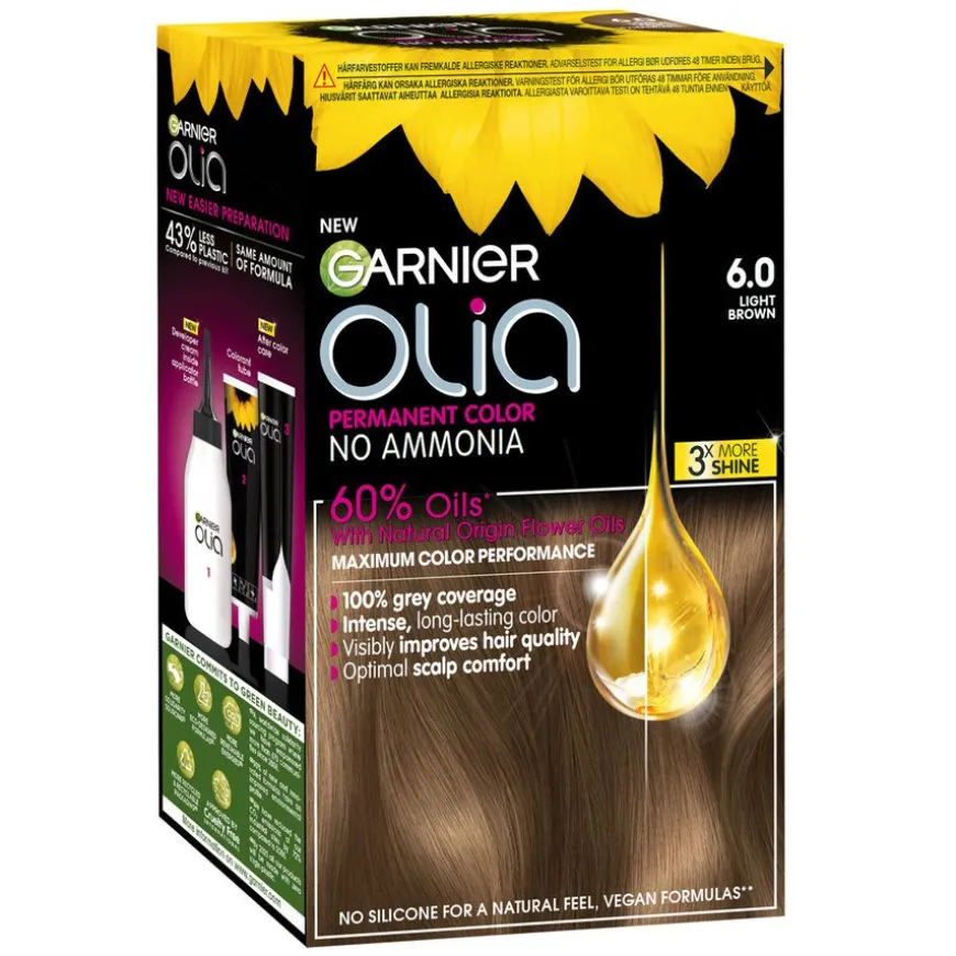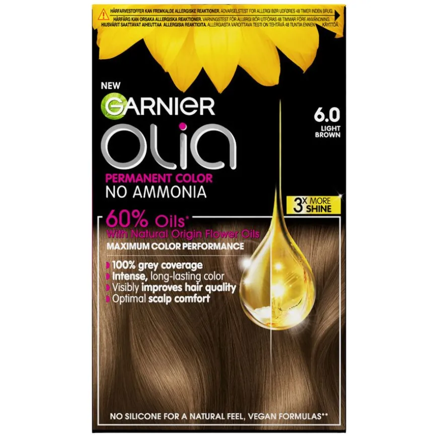 Garnier Olia 6.0 Light Brown er en permanent hårfarge uten ammoniakk som er drevet av 60 % oljer* for maksimal fargeprestasjon og synlig forbedring av hårkvaliteten. Olia 6.0 gir deg opptil 100 % gråhårsdekning og en optimal komfort for hodebunnen. 98 % av kvinnene fant ingen synlige skader** på håret.