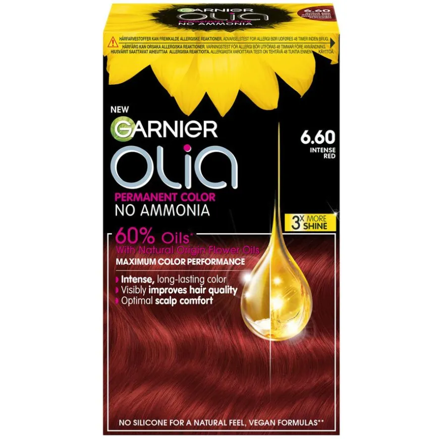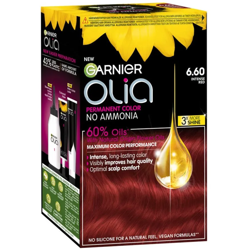 Garnier Olia 6.60 Intense Red er en permanent hårfarge uten ammoniakk som er drevet av 60 % oljer* for maksimal fargeprestasjon, synlig forbedring av hårkvaliteten og optimal komfort for hodebunnen. Olia 6.60 anbefales ikke til deg som har 100 % grått hår. 98 % av kvinnene fant ingen synlige skader** på håret.