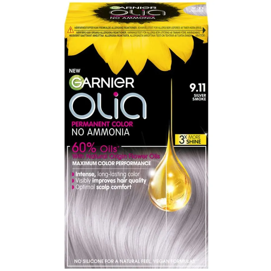 Garnier Olia 9.11 Silver Smoke er en permanent hårfarge uten ammoniakk som er drevet av 60 % oljer* for maksimal fargeprestasjon, synlig forbedring av hårkvaliteten og optimal komfort for hodebunnen. Olia 9.11 anbefales ikke til deg som har 100 % grått hår. 98 % av kvinnene fant ingen synlige skader** på håret.