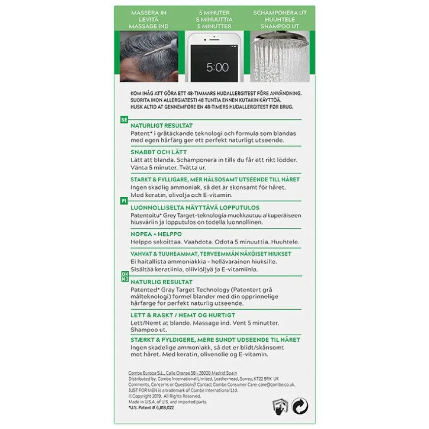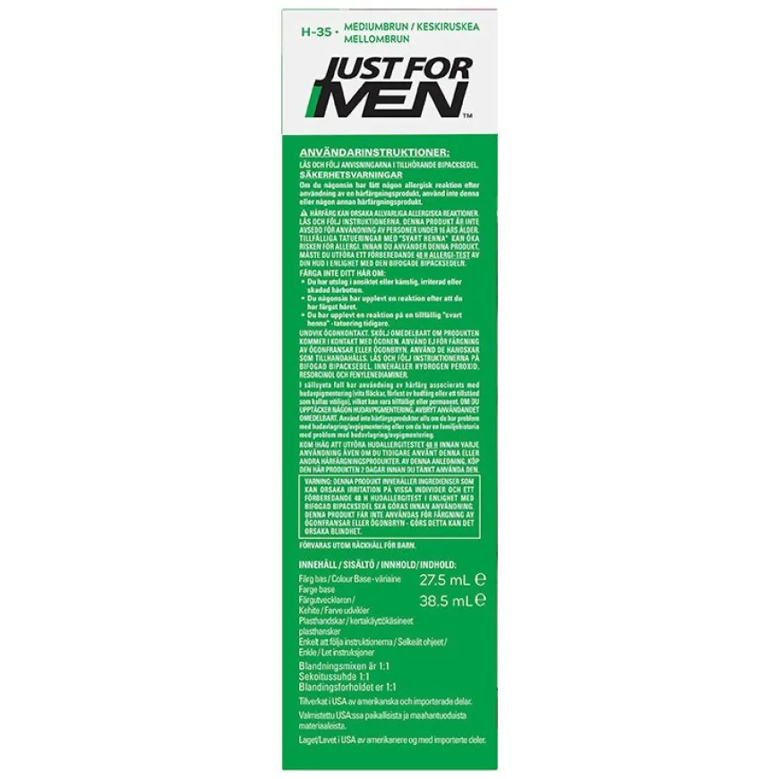 Original Formula Medium Brown fra Just For Men er en hårfarge somfjerner det grå håret på bare fem minutter. Fargen dekker dine grå hår helt og effektivt.Fargen fokuserer bare på det grå håret og bevarer subtile variasjoner av din naturlige hårfarge. Den erenkel å påføre, og det tar bare fem minutter å farge grått hår som også varer til det grå vokser tilbake.Den inneholder protein, vitamin E, aloe og kamille som gir næring til håret ditt når du farger det. Hårfartgen får håret til å se sunnere og tykkere ut etter hver faring. Den ammoniakfrie formelen forårsaker ingen skade på håret. Håret blir mykt og lettere å håndtere.