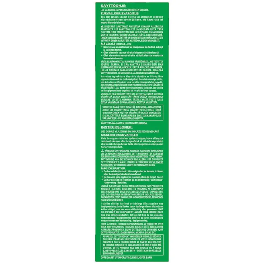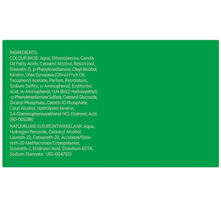 Färg: Aqua,Ethanolamine,Canola Oil Fatty Acids,Cetearyl Alcohol,Resorcinol,Steareth-21,p-Phenylenediamine,Oleyl Alcohol,Parfum,Petrolatum,Sodium Sulfite,p-Aminophenol,Erythorbic Acidm-Aminophenol,N,N-Bis(2-Hydroxyethyl)-p-Phenylenediamine Sulfate,Cetearyl Glucoside,Dicetyl PhosphateTrisodium EDTA,Ceteth-10 Phosphate,Cetyl Alcohol,2,4-Diaminophenoxyethanol Sulfate FÄRGUTVECKLAREN: Aqua,Hydrogen Peroxide,Cetearyl Alcohol,Laureth-23,Ceteareth-20,Acrylates/Steareth-20 Methylacrylate Crosspolymer,Steareth-2,Etidronic Acid,Disodium EDTA,Sodium Stannate