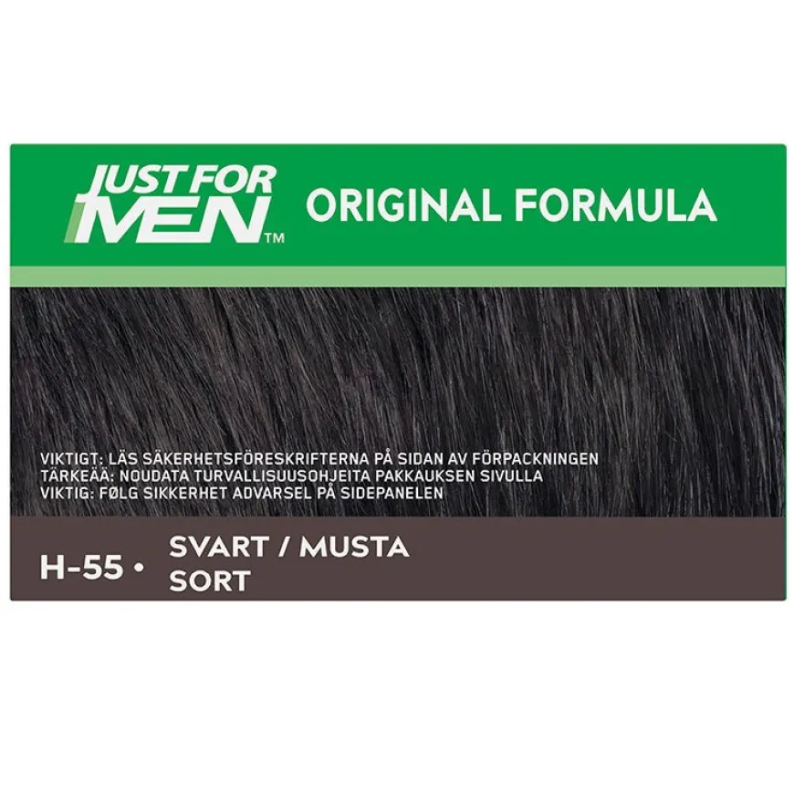 Original Formula Real Blackfra Just For Men er en hårfarge somfjerner det grå håret på bare fem minutter. Fargen dekker dine grå hår helt og effektivt.Fargen fokuserer bare på det grå håret og bevarer subtile variasjoner av din naturlige hårfarge. Den erenkel å påføre, og det tar bare fem minutter å farge grått hår som også varer til det grå vokser tilbake.Den inneholder protein, vitamin E, aloe og kamille som gir næring til håret ditt når du farger det. Hårfartgen får håret til å se sunnere og tykkere ut etter hver faring. Den ammoniakfrie formelen forårsaker ingen skade på håret. Håret blir mykt og lettere å håndtere.