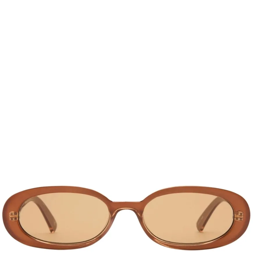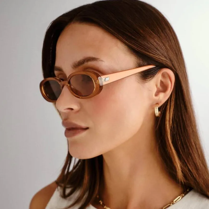 Outta Love Caramel fra Le Specs er en feminin solbrille med en smal, ovalt formet ramme som oser av 90-talls selvtillit og stil. Den flate profilen og de karakteristiske gulldetaljene på stengene gir et moderne og raffinert uttrykk. Modellen er spesielt utformet for smalere ansiktsformer og fremhever ansiktstrekkene uten å dekke dem. Rammen er produsert i Ecozen T110 – en BPA-fri polymerplast med 10 % plantebasert biomasse – som gir lav vekt, høy slitestyrke og komfort. Glassene i tan tint er laget av ripe- og knusebestandig polykarbonat og gir kategori 2 UV-beskyttelse. En favoritt blant kjendiser som Bella Hadid, Dua Lipa og Olivia Rodrigo.