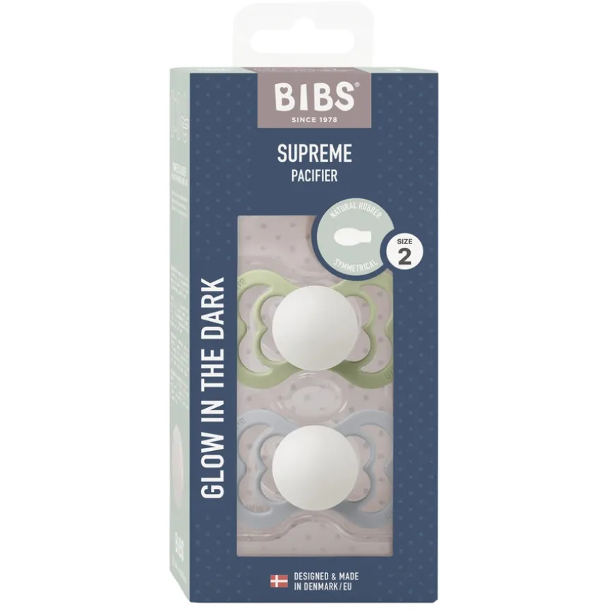 Pacifier Supreme Latex Glow er BIBS eksklusive smokk med et bredt skjold og en symmetrisk, flat dråpeformet sugedel.BIBS Supreme Glow har samme høye kvalitet som de originale BIBS-smokkene, men kommer med en praktisk glødefunksjon. Glødefunksjonen gjør det enkelt for både foreldre og små å finne smokkene i mørket. Hold smokken opp mot en lyskilde i 5-10 sekunder for å aktivere effekten. Smokkene er 100% fri for BPA og ftalater. De er produsert og designet i Danmark og har den påkrevde europeiske EN 1400+A2-godkjennelsen.