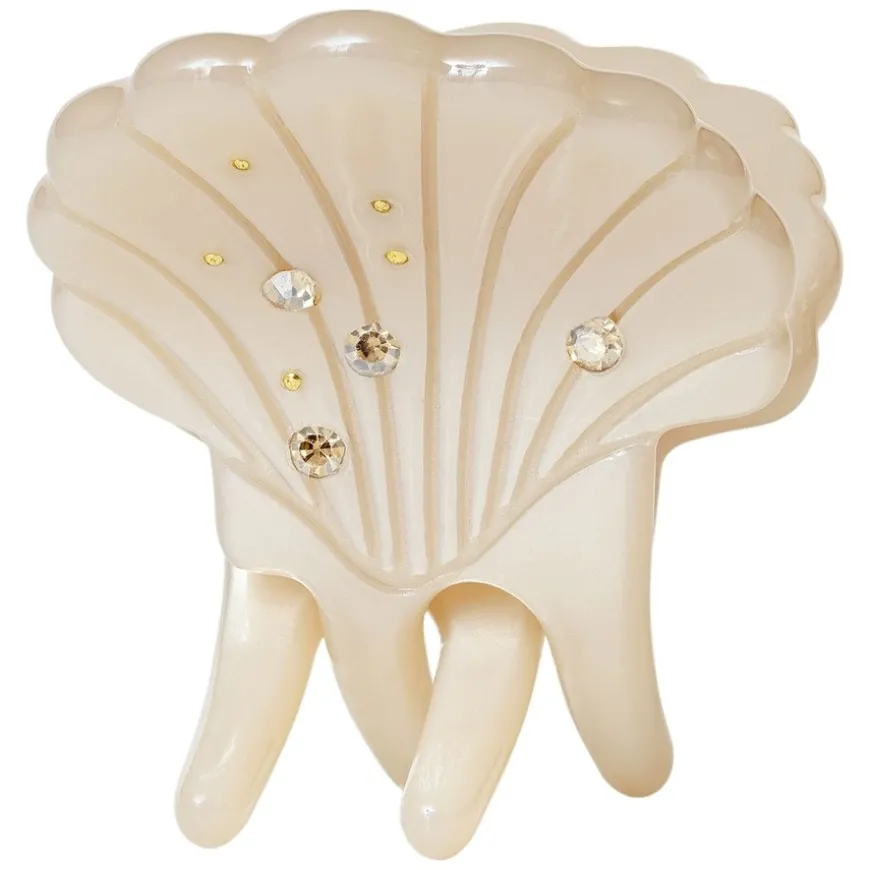 Pasha Hairclaw Oyster fra Maanesten lar deg kanalisere essensen av Afrodite med sin elegante skjellform. Som et symbol på kjærlighet, skjønnhet og gjenfødelse, tilfører denne hårklypen en mytisk og feminin touch til frisyren din. Den er laget av acetat og jern med miljøvennlig elektrobelegg og er utsmykket med glitrende rhinestones som skaper et subtilt, luksuriøst uttrykk. Med sin kompakte størrelse på 2,5 cm i bredde og høyde, er den perfekt for å holde små hårseksjoner på plass og skape delikate frisyrer.