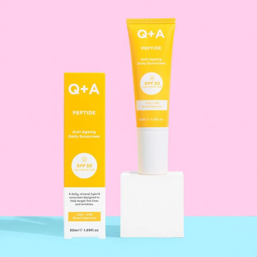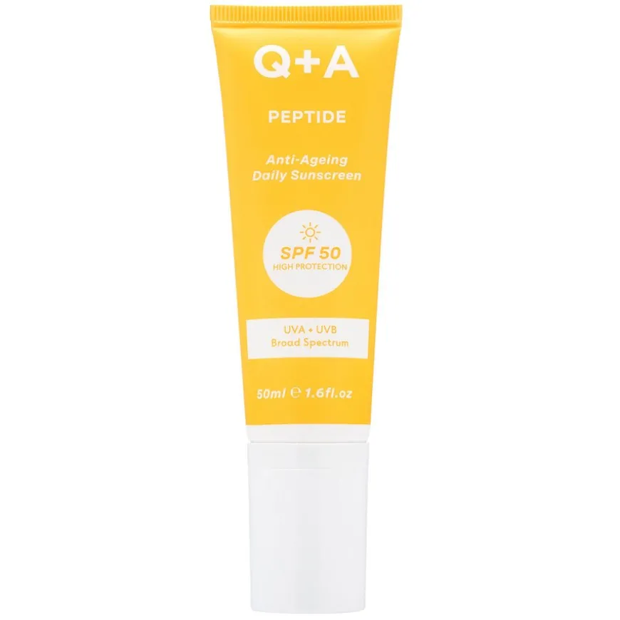 Peptide Face Sunscreen fra Q+A er en foryngende solkrem med anti-age for daglig bruk til ansiktet. Solkremen inneholder vegansk kollagenprepeptid og ekstrakt fra adzuki-bønner for å opprettholde kollagennivået i huden samtidig som den beskytter mot solen. Den hybride mineralformelen har en ultralett tekstur som trekker seg raskt inn i huden uten å etterlate hvite merker.