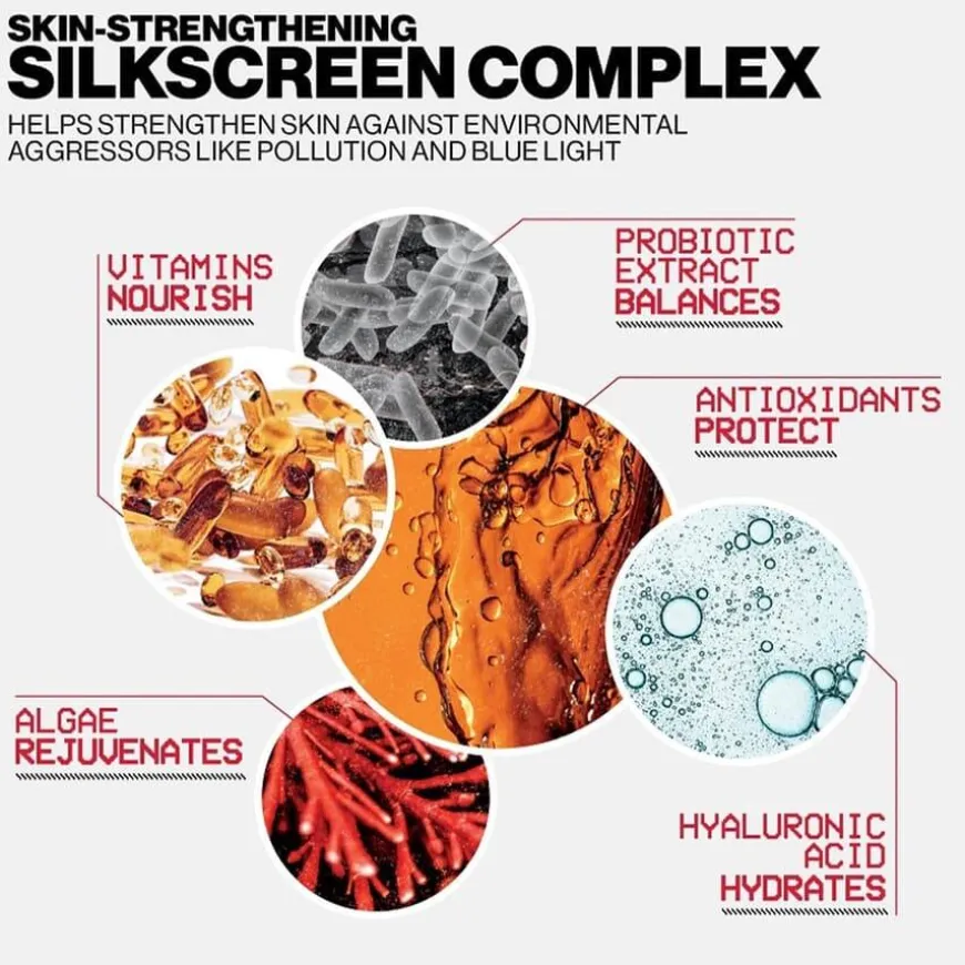 - Inneholder i tillegg Silkscreen Complex, som er en hudpleiende blanding av antioksidanter, hyaluronsyre, probiotisk ekstrakt, vitaminer og alge som tilfører huden næring, samt balanserer og beskytter den.