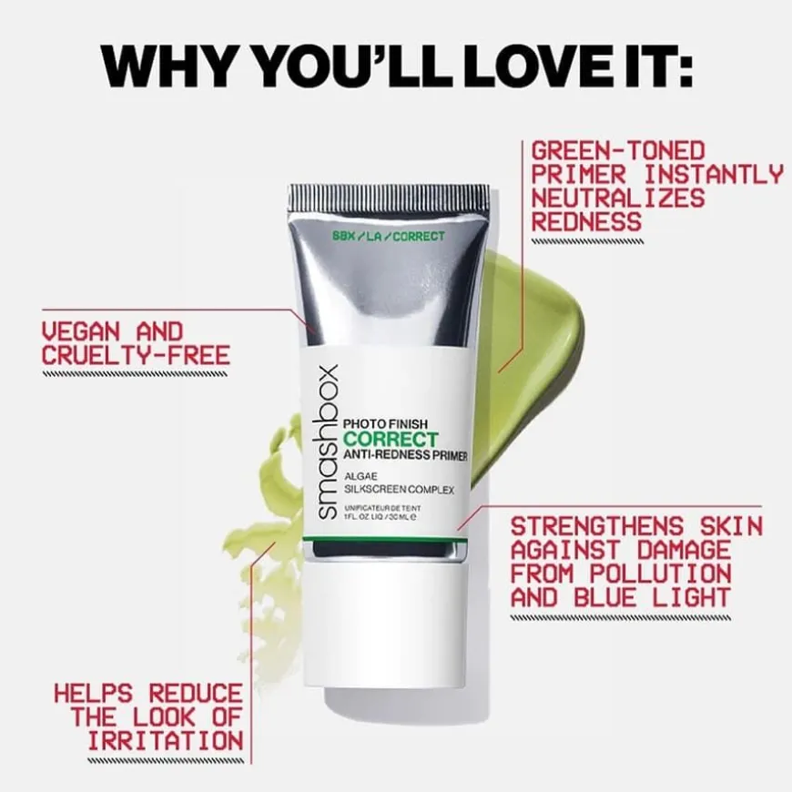 Photo Finish Correct Anti-Redness Primer er en vegansk primer som nøytraliserer rødhet og lindrer irritasjon i huden. Primeren har en lett tekstur med grønne pigmenter som beroliger og beroliger stresset hud og minimerer synligheten av porer for en nøytralisert base.