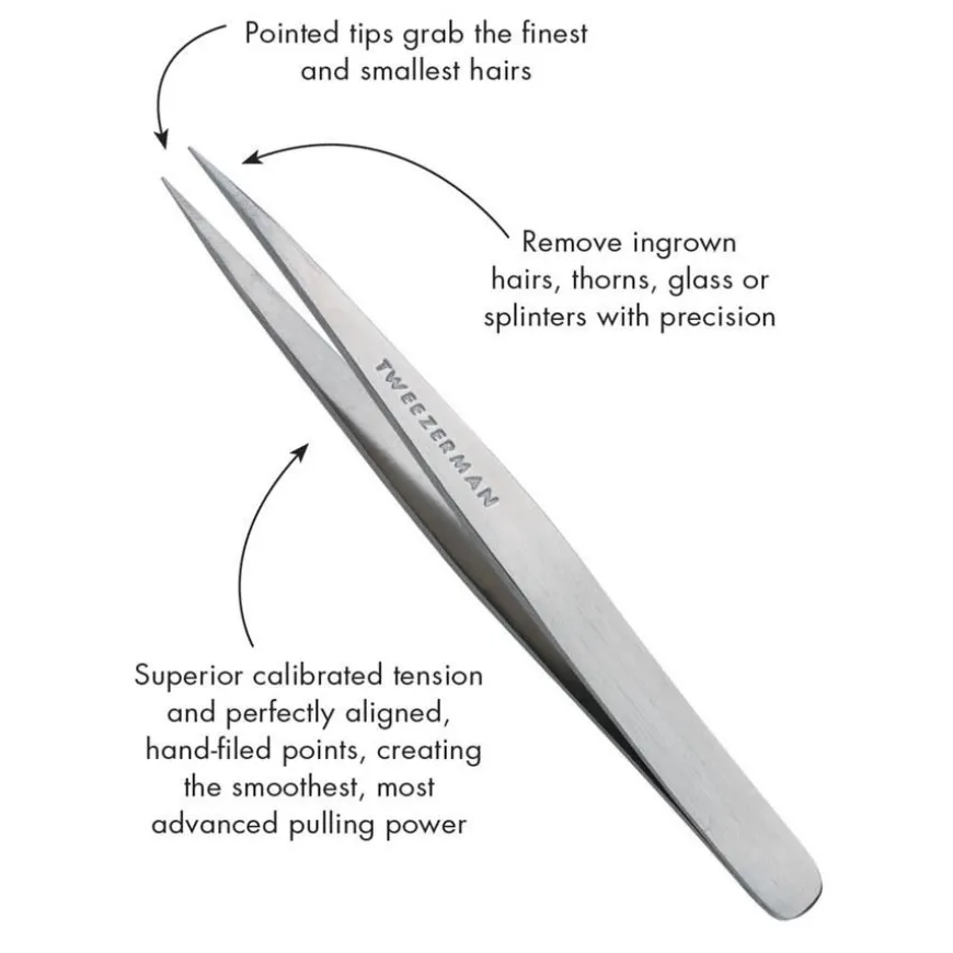 Den perfekte pinsett for en perfeksjonist! Denne unike pinsetten med spiss tupp får tak i selv de aller minste hårstrå. Den er også ideell for å fjerne inngrodde hårstrå (bryn, skjegg, bikinilinje, etc.), samt til å fjerne fliser i huden. Ypperlig til også å påføre løsvipper. Hvis pinsetten anvendes under huden; desinfiser både hud og pinsett før og etter bruk. Pinsetten er i rustfritt stål og kan steriliseres.