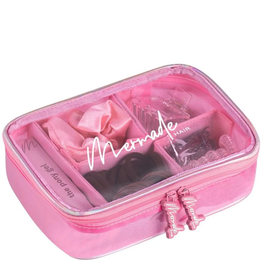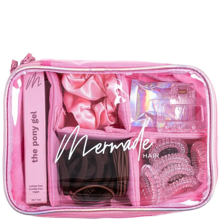 Pony Kit er ensupersøt skjønnhetsveske som har alt det grunnleggende håret ditt trenger på en plass. Med en rekke hårstrikk, bobby pins, en enkel å pakke kam og Mermades spesielle Pony Gel-formel, har du alt du trenger for perfekt up-do. I tillegg kan du flytte eller fjerne skilleveggene for å passe til tilbehøret ditt eller sminke.