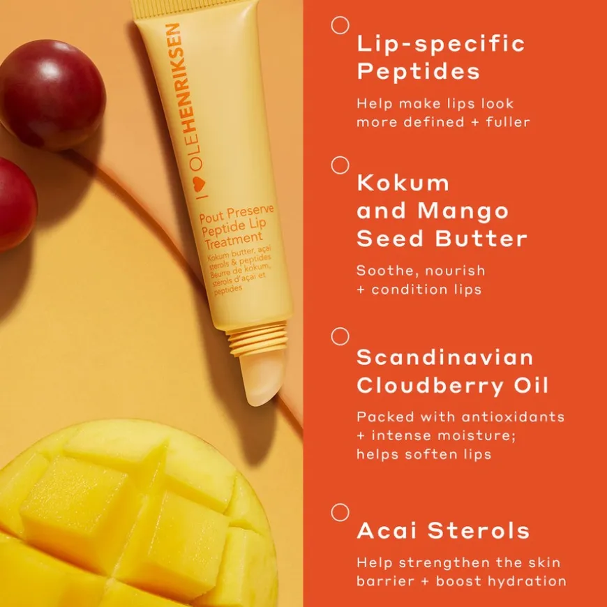 Pout Preserve Peptide Lip Treatment er et alt-i-ett leppeprodukt.Anti-aging behandling samtidig som du får juicy og fyldige lepper.Pout Preserve Peptide er en rik og nærende leppebalsam som beskytter, mykgjør og pleier selv de tørreste lepper. Med en fuktighetsgivende egenskap gir den deg delikate kysseklare lepper. Dette deilige leppeproduktet fra Ole Henriksen er proppet med peptider, kokumsmør og botaniske oljer som aktiverer leppenes eget kollagen – som en luksusferie for leppene dine.