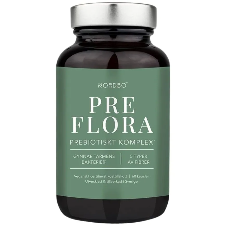 NORDBO PreFlora er et prebiotisk kosttilskudd som fremmer bakteriefloraen. Kapslene inneholder et kompleks av fibre og stivelse: ResistAid™, inulin, resistent stivelse, pektin og FOS.