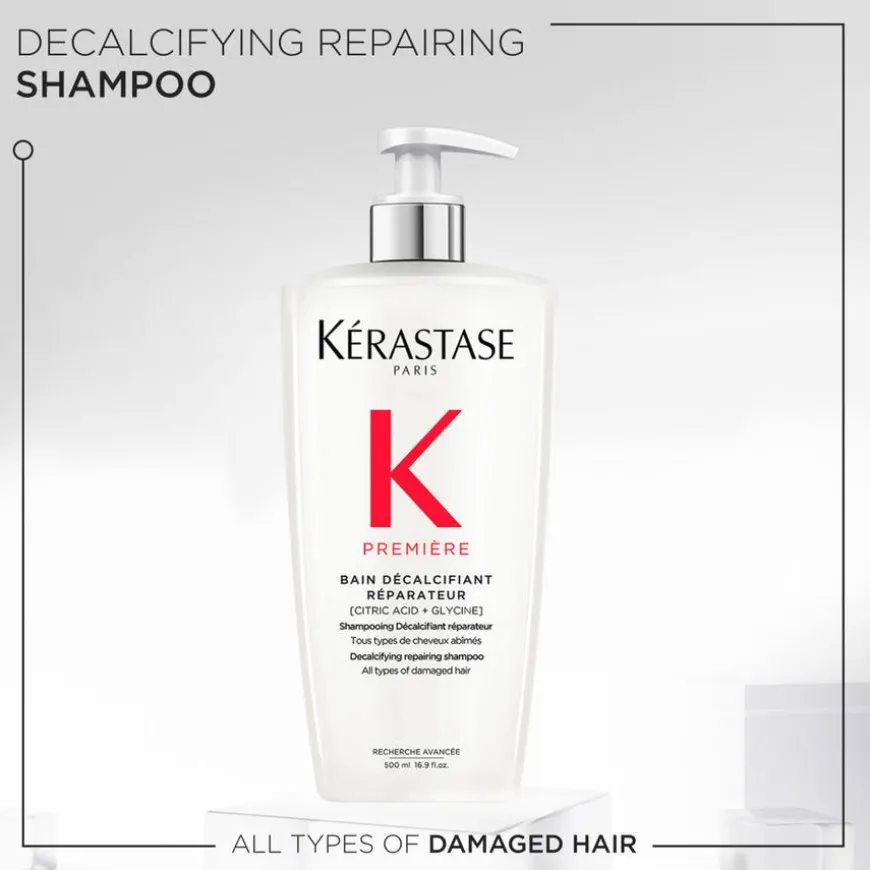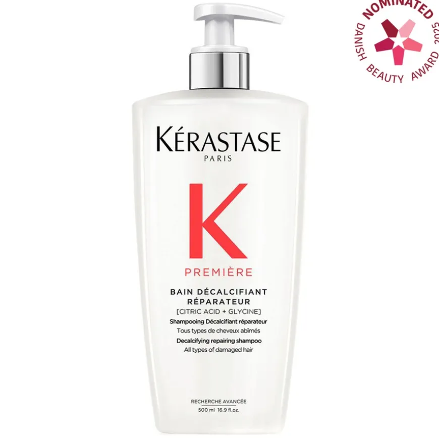 Première Pro Bain Décalcifiant Rénovateur Shampoo fra Kérastase er en reparerende shampoo som fjerner kalk fra skadet hår. En fyldig, dobbeltvirkende shampoo som fjerner kalk fra innsiden, styrker og reparerer skadet hår. Rengjør skånsomt hodebunn og hår samtidig som den fjerner kalkrester. Denne profesjonelle shampooen rengjør hodebunnen og håret skånsomt samtidig som den fjerner kalk, som ytterligere svekker bleket eller farget hår. Bidrar til å redusere knekte hårstrå og nøytralisere livløst hår ved å reparere håret fra kjernen.