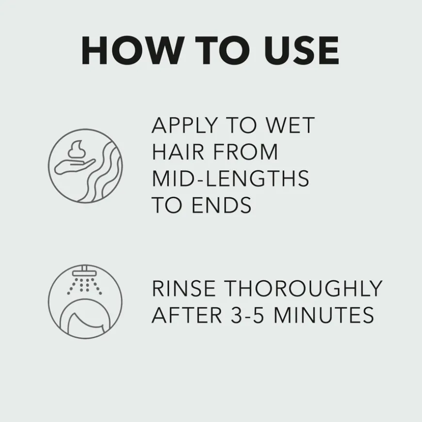 - Påføres i vått hår fra lengdene til spissene etter shampoonering.